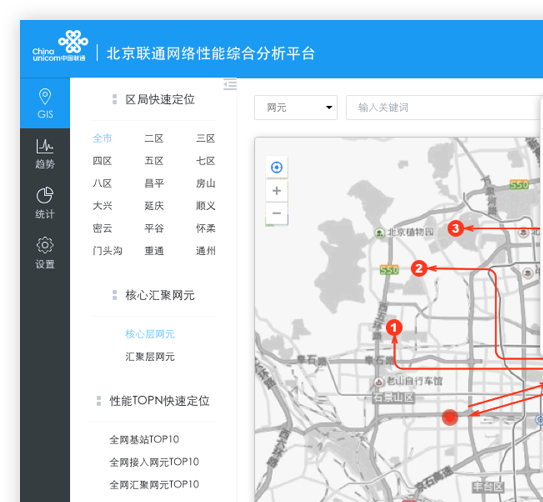 網(wǎng)絡(luò)性能綜合分析平臺(tái)主要是對(duì)運(yùn)營(yíng)商各類傳輸網(wǎng)性能與負(fù)荷情況進(jìn)行呈現(xiàn)、統(tǒng)計(jì)與趨勢(shì)分析。平臺(tái)結(jié)合GIS模塊呈現(xiàn)網(wǎng)元、信源設(shè)備物理位置及性能信息,展現(xiàn)區(qū)局、匯聚區(qū)區(qū)域性信息;設(shè)備、業(yè)務(wù)鏈路的性能趨勢(shì)展現(xiàn);結(jié)合大數(shù)據(jù)分析引擎支持網(wǎng)絡(luò)秒級(jí)性能統(tǒng)計(jì)分析功能,以及定制化搜索引擎等。